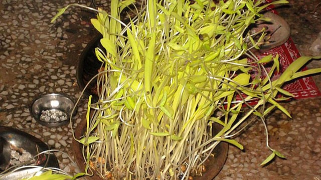 परम्परानुसार पर्व से नौ अथवा दस दिन पूर्व पत्तों से बने दोने या रिंगाल की टोकरियों में हरेला बोया जाता है। जिसमें उपलब्धतानुसार पाँच, सात अथवा नौ प्रकार के धान्य यथा- धान, मक्का, तिल, उड़द, गहत, भट्ट, जौं व सरसों के बीजों को बोया जाता है। देवस्थान में इन टोकरियों को रखने के उपरान्त रोजाना इन्हें जल के छींटों से सींचा जाता है। दो-तीन दिनों में ये बीज अंकुरित होकर हरेले तक सात-आठ इंच लम्बे तृण का आकार पा लेते हैं।