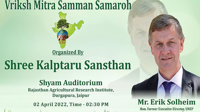 ट्री मैन ऑफ इंडिया के नाम से मशहूर पर्यावरणविद विष्णु लाम्बा ने बताया कि इस बार संयुक्त राष्ट्र पर्यावरण कार्यक्रम के छठे प्रमुख, महान पर्यावरणविद और वैश्विक नेता एरिक सोलहेम की गरिमामय उपस्थिति हम सब प्रदेश वासियों के लिए गौरवान्वित करने वाली हैं । यह आयोजन 2 अप्रेल को दोपहर 2:30 बजे दुर्गापुरा स्थित कृषि अनुसंधान केंद्र के श्याम ऑडिटोरियम" होगा।