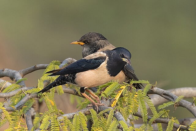 रोज़ी स्टार्लिंग (Rosy Starling) एक आकर्षक प्रवासी पक्षी है, जिसकी सबसे बड़ी खूबी इसकी सामूहिक जीवन शैली है। ये पक्षी सर्वाहारी होते हैं और कीड़ों, घास के मैदानों और खेतों वाले इलाकों में अच्छी तरह पनपते हैं। यह हज़ारों की संख्या में झुंड बनाकर उड़ते हैं और खेतों, चारागाहों व खुले इलाकों में एक साथ भोजन करते हैं। इनका गुलाबी शरीर और काले सिर-पंख इन्हें आसानी से पहचानने योग्य बनाता है। तेज़ आवाज़ में चहचहाना और पेड़ों-इमारतों पर सामूहिक रूप से बसेरा करना भी इनकी खास पहचान है।