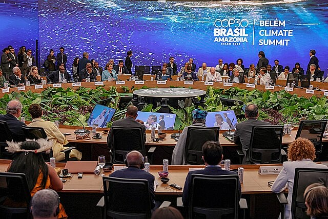पिछले साल (2025) ब्राज़ील में हुए COP30 सम्मेलन की एक गोलमेज बैठक में भाग लेते सदस्य देशों के प्रतिनिधि।