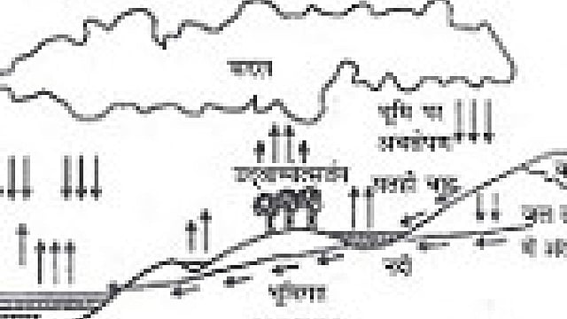 2. वर्षा के दौरान, पानी की उपलब्धता अवक्षेपण के साथ-साथ प्राकृतिक एवं मानवजनित धारण क्षमता के रूप में होती है; जिसका परिणाम बाढ़ होती है। वर्षारहित मौसम के दौरान उच्च उद्वाष्पन से पानी की मात्रा में अत्यंत कमी आ जाती है। बाढ़ एवं सूखे जैसे हालात जल चक्र का निर्माण करते हैं। इसका कारण देश में तेजी से घट रहे वन आवरण हैं।