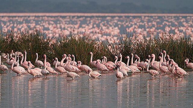 फ्लेमिंगो की गुलाबी रंगत जन्मजात नहीं होती, बल्कि झील के खारे पानी में पनपने वाले एल्गी और ब्राइन श्रिम्प खाने से यह रंग विकसित होता है।