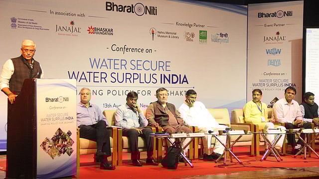 भारत नीति द्वारा जल शक्ति मंत्रालय, जनाजल और भास्कर फाउंडेशन के सहयोग से मंगलवार को नई दिल्ली स्थित नेहरु मेमोरियल पुस्तकालय सभागार में ‘‘वाटर सिक्योर और वाटर सरप्लस इंडिया’’ विषय पर एक दिवसीय सम्मेलन का आयोजन किया गया था। जिसमें पानी के विशेषज्ञों ने जल संरक्षण के लिए विभिन्न उपाय सुझाए। साथ ही जलशक्ति मंत्री गजेंद्र सिंह शेखावत ने गांव इकाई से जल प्रबंधन का कार्य शुरू करने और जन सहभागिता पर जोर दिया। इसके अलावा जल संरक्षण को पाठ्यक्रम में शामिल करने का सुझाव भी आया।