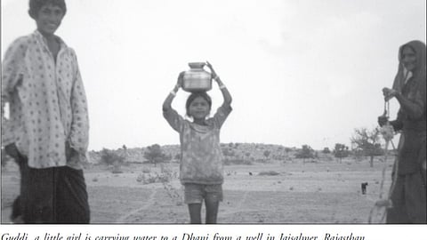 In every household, particularly in the rural areas in Rajasthan women and girl children bear the responsibility of collecting transporting, storing, providing and managing water. In places, where there is no water for farming, men migrate to urban areas in search of work leaving women behind to fond for the old and the children. Women spend most of their time, collecting water with little time for other productive work. This impacts on the education of the girl child, for if the girl is herself not collecting water, she is looking after the home and her siblings when her mother is away.